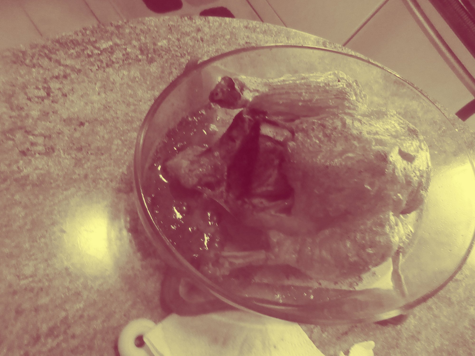 The baguette is then stuffed into the chicken’s cavity. The chicken was then placed into the middle of a pre-heated oven. Under 2 hours later it was ready